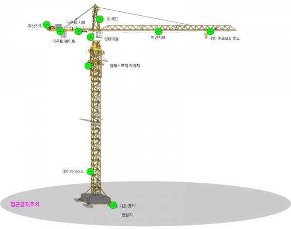 지브 불균형 상태에서 유압실린더 작동, 텔레스코픽 케이지의 좌굴 발생 | 상승작업 중 절대로 권상, 트롤리 이동 및 선회작업 금지( 전체 재해발생 원인의 30% 점유) |